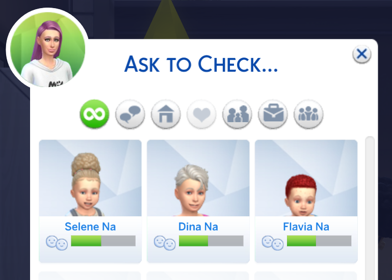 In addition to some available social interactions, clicking “Ask to check on” will open the following window where you can choose which child to have examined: